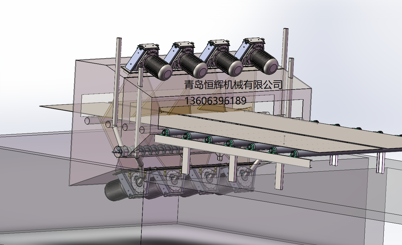抛丸器的布置:采用8台电机直驱抛丸器,抛丸量可达900kg/min,抛丸速度≥82m/s,抛丸器布置经过三维模拟,上下抛丸器一一对应,避免薄板变形,消除型钢死角,一次抛打和二次反弹弹丸避开辊道,弹丸覆盖均匀一致。清理室的防护:抛丸室护板采用高耐磨的轧制Mn13护板进行防护,